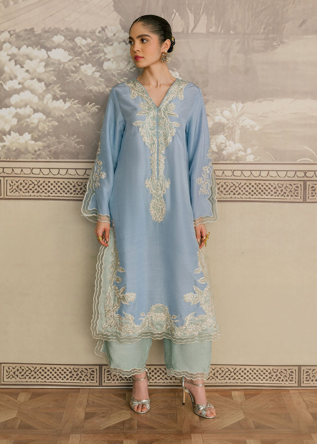 Afrozeh introduces The Brides Edit collection, exquisite wedding dresses for Pakistani women featuring hand-embellished organza fabric with intricate embroidery, including front and back bodies, panels, sleeves, and dupatta. The set is completed with a raw silk dyed trouser for a sophisticated look, making it a luxurious and elegant choice for brides.