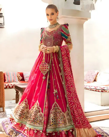 Gulaal Chaandni Wedding Dresses are meticulously crafted with intricate adda work, sheesha embellishments, embroidery, and sequins on organza fabric. The front bodice is embellished, while the back bodice, sleeves, and angrakha panels feature embroidered organza. The dupatta showcases embroidered motifs on raw silk with golden zari tassels. The dress is designed for comfort with dyed inner lining and a luxurious raw silk lehnga, offering an elegant and luxurious wedding ensemble.