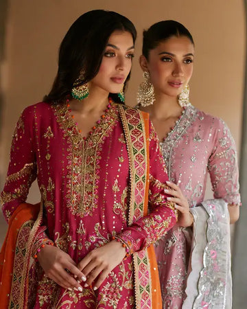 Élan's Wedding Festive bridal dress collection for Pakistani ladies blends sun-kissed elegance with opulence. The hand-embellished details, flowing silhouette, and harmonious colour palette create a sophisticated and botanical-inspired ensemble. This exquisite collection seamlessly combines tradition with luxury, making it a captivating and elegant choice for Pakistani brides' celebratory events.