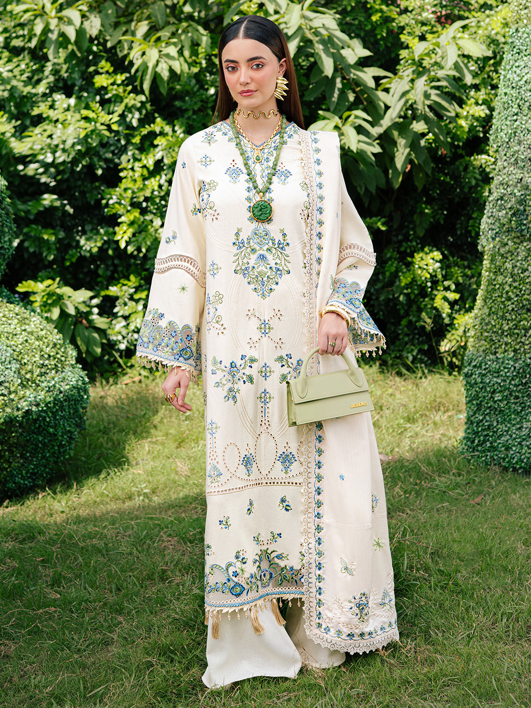 Élan's Wedding Festive bridal dress collection for Pakistani ladies blends sun-kissed elegance with opulence. The hand-embellished details, flowing silhouette, and harmonious colour palette create a sophisticated and botanical-inspired ensemble. This exquisite collection seamlessly combines tradition with luxury, making it a captivating and elegant choice for Pakistani brides' celebratory events.