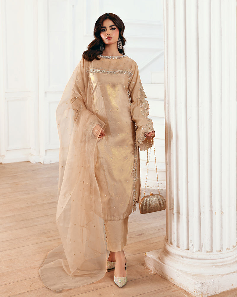 Organza shirt featuring handcrafted adda work with stones, pearls, cutdana, and crystal embellishments Chiffon dupatta...