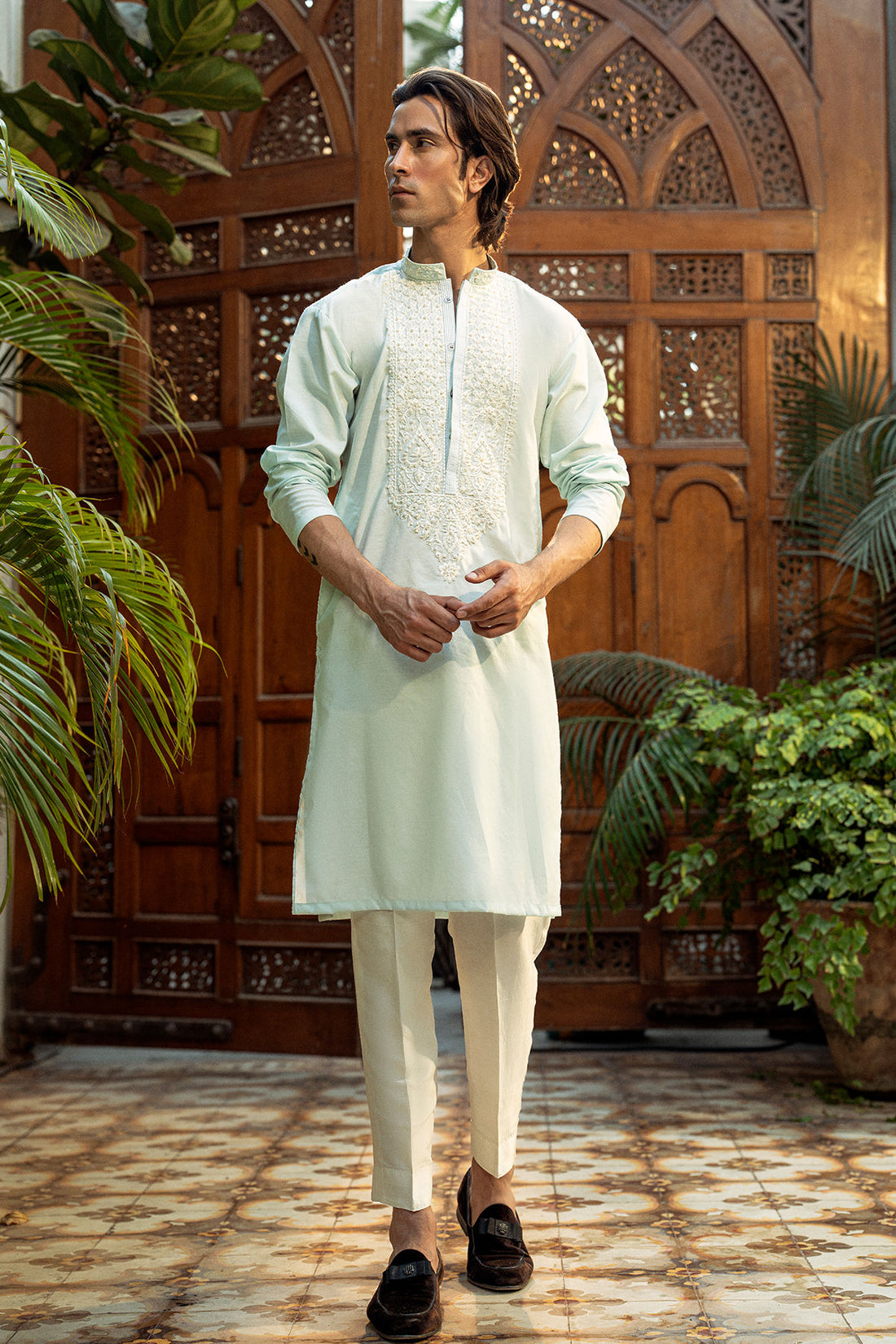 Elegant long jacket crafted on a soft ice blue canvas, embellished with detailed silver and...