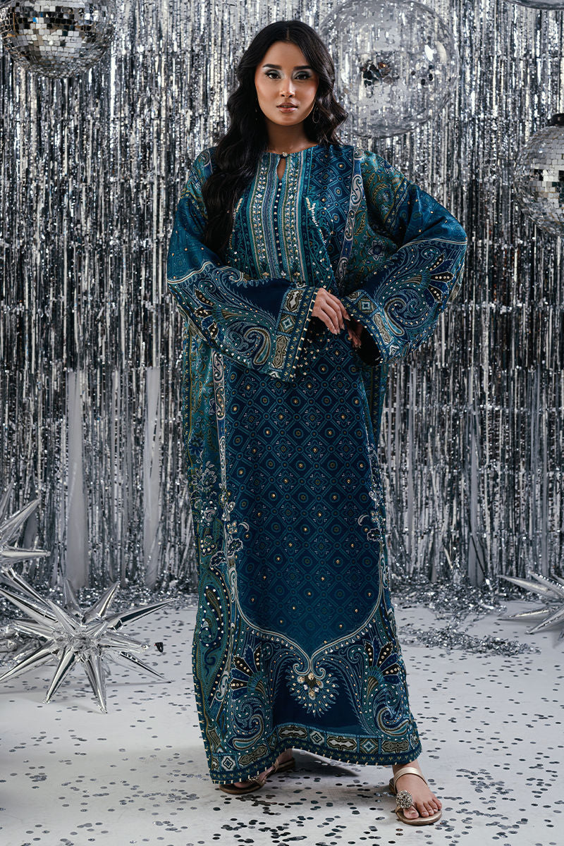 A striking digitally printed kaftan adorned with exquisite handwork and delicate embellishments that add a...
