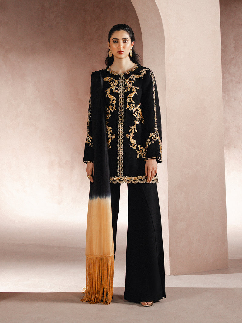 A black 3-piece crinkle chiffon ensemble featuring adda, embroidery, and sequin detailing across the neckline,...