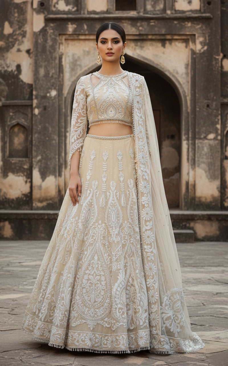 A soft blush ensemble illuminated with intricate silver and pastel handwork, this look captures romance...
