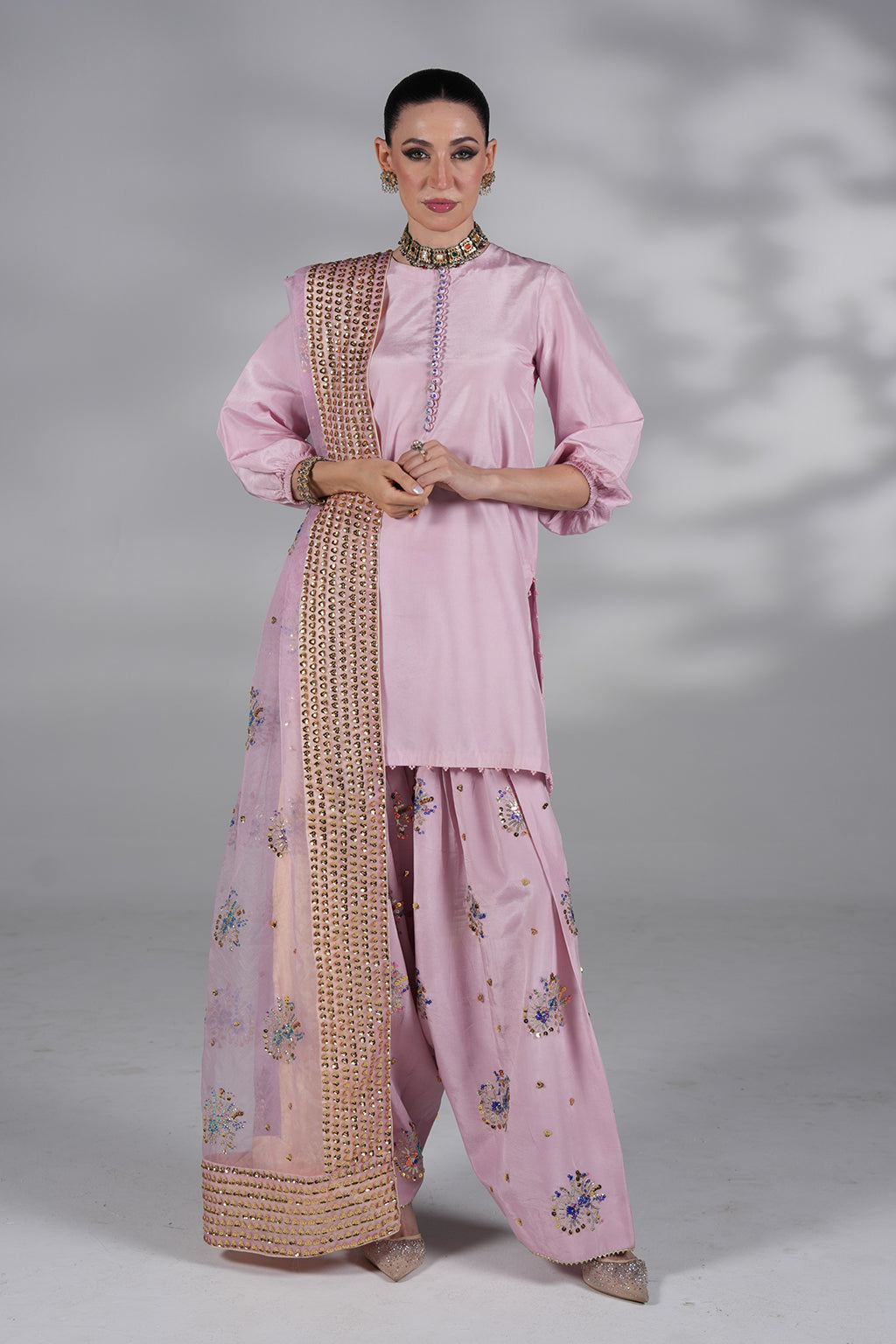 Lilac embroidered chiffon shirt with handwork, paired with premium silk plazo pant with lace detailing....
