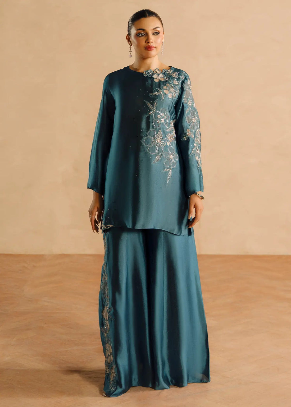 A luminous palette defines this light turquoise ensemble, designed to stand out through refined detail....
