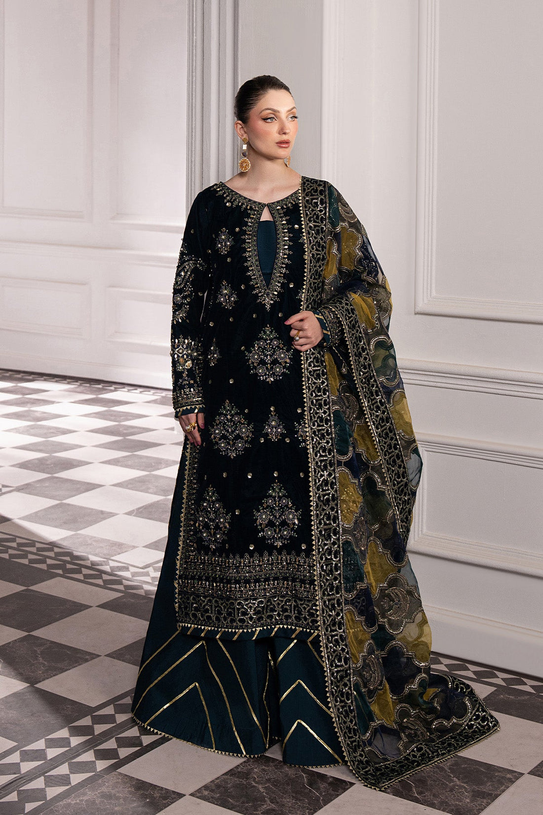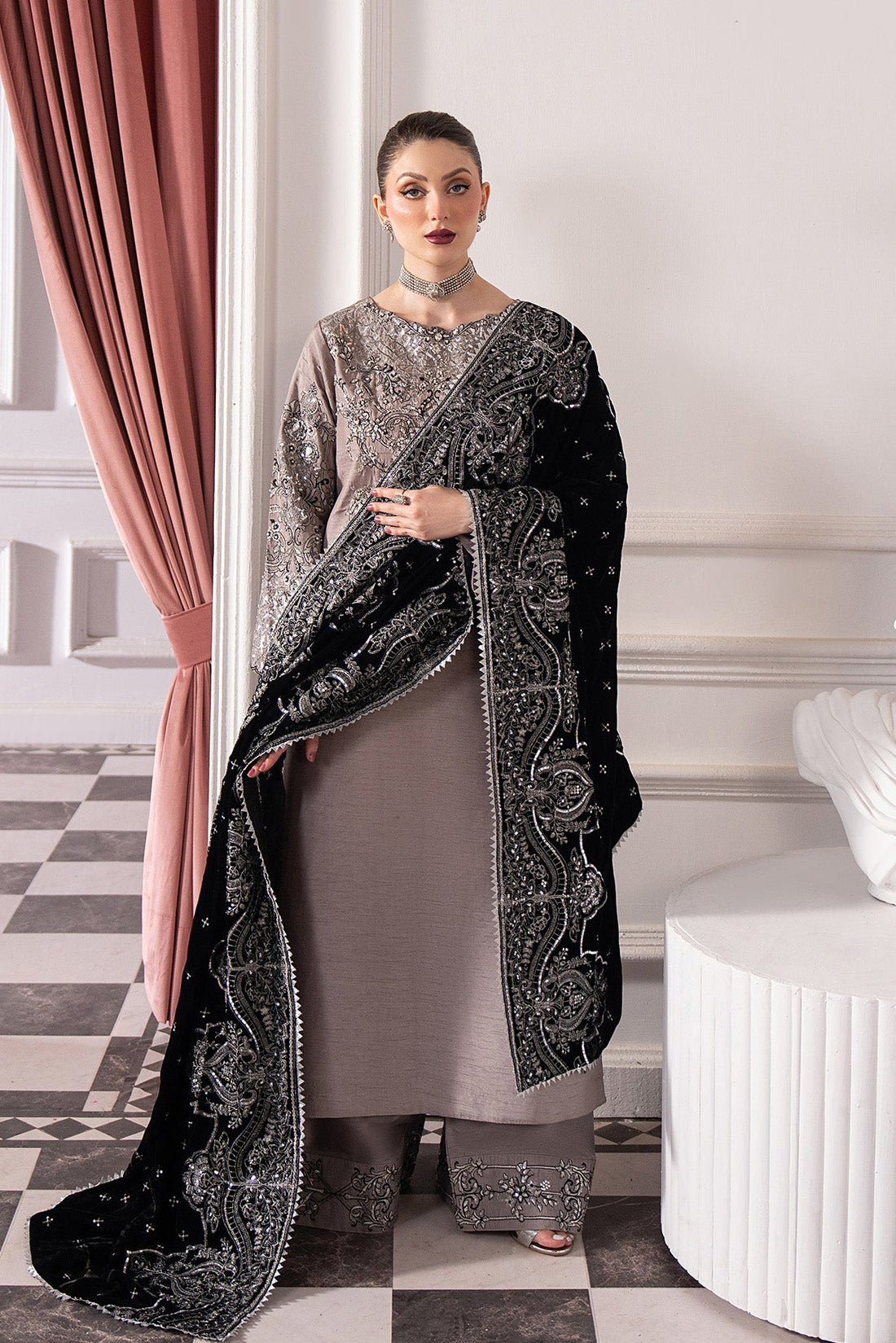 Embroidered Silk Front With Ada WorkPlain Silk BackEmbroidered Sleeves With Ada WorkEmbroidered Velvet Shawl (Ready-to-Wear)Dyed...