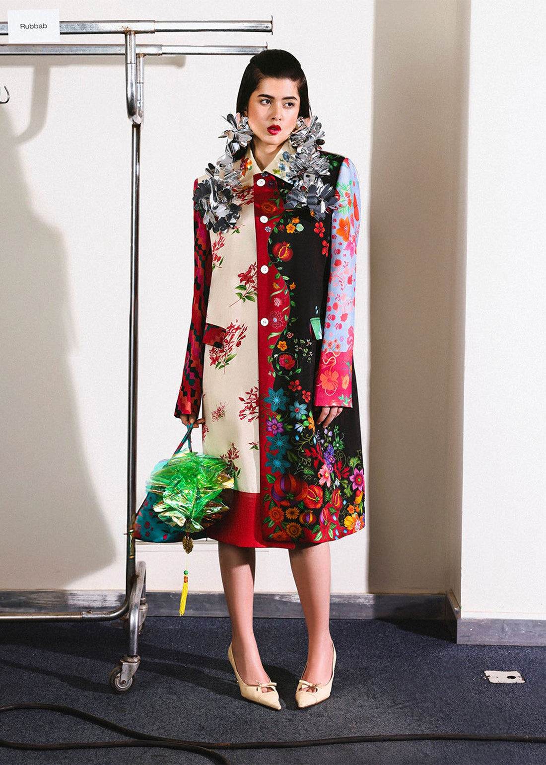 This eclectic silk trench coat is a vibrant fusion of print, texture, and bold storytelling....