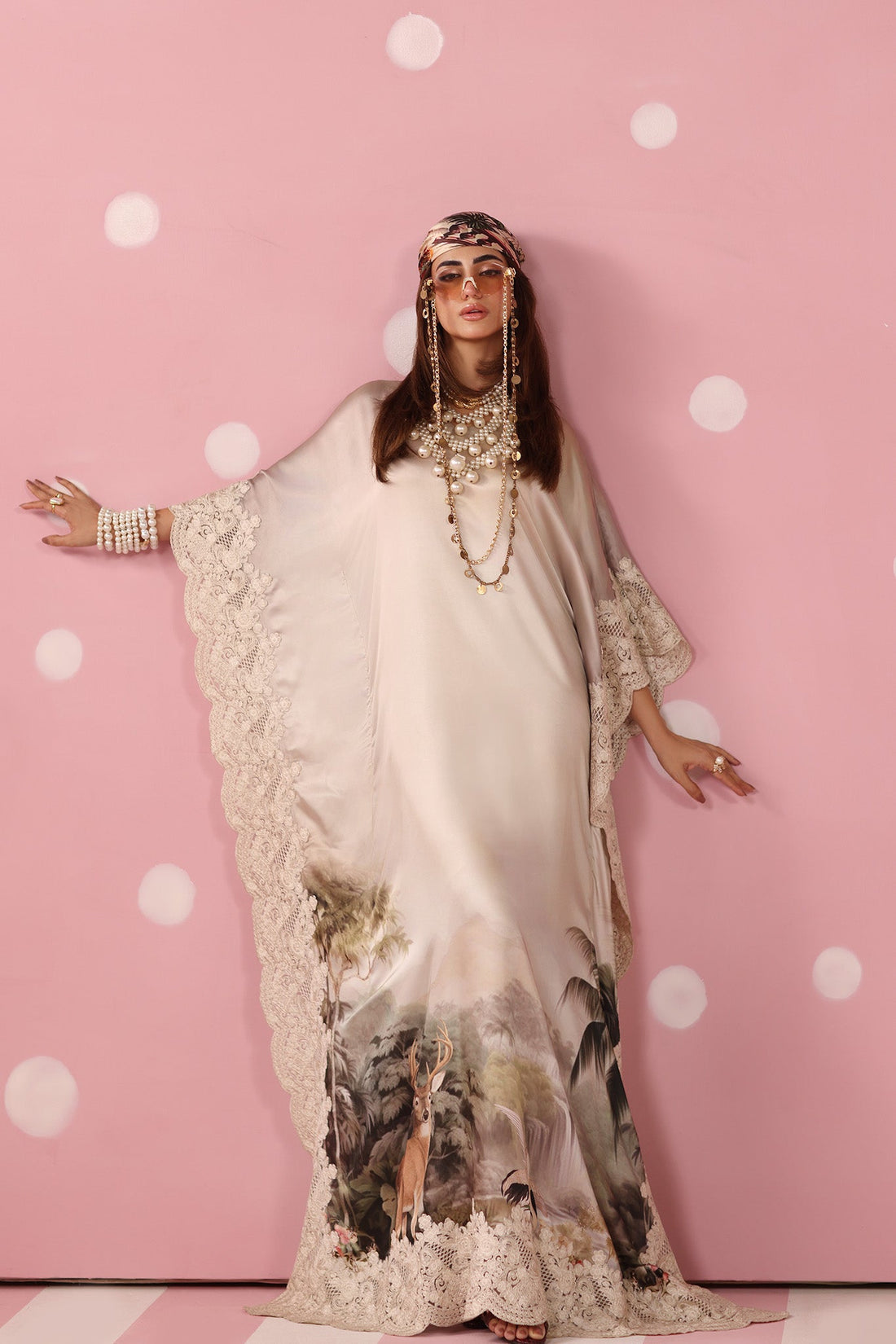 Ethereal sophistication meets artisanal craftsmanship in a resplendent kaftan in a delicate shade of gold...