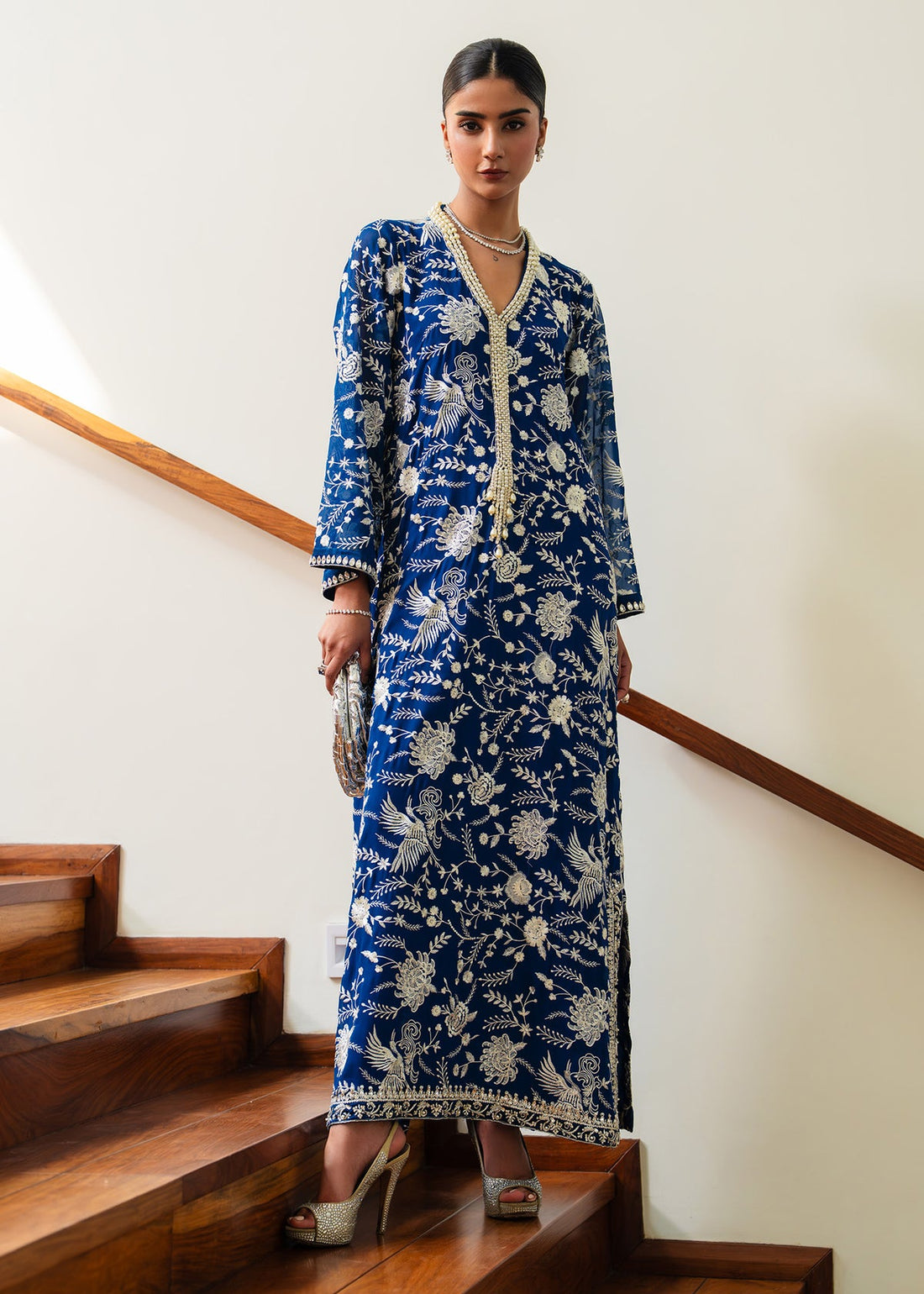 Drape yourself in serenity with Zavia, a blue chiffon kaftan designed for modern luxury. Its...