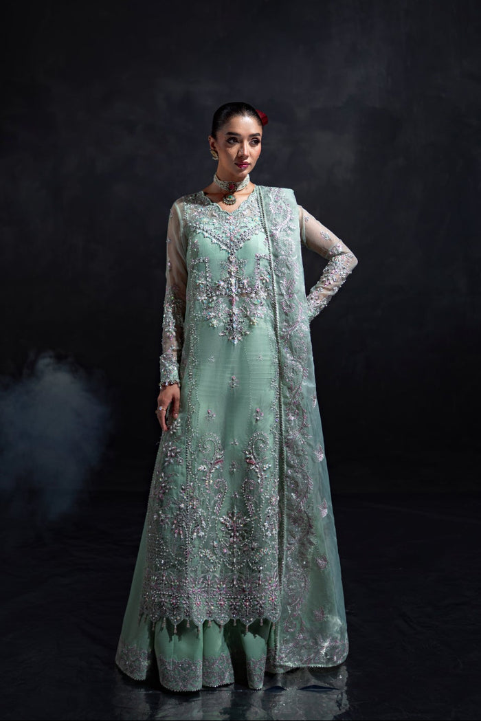 Zeesha is a semi-formal pistachio masterpiece crafted on luxurious organza. The frock features intricate adda...