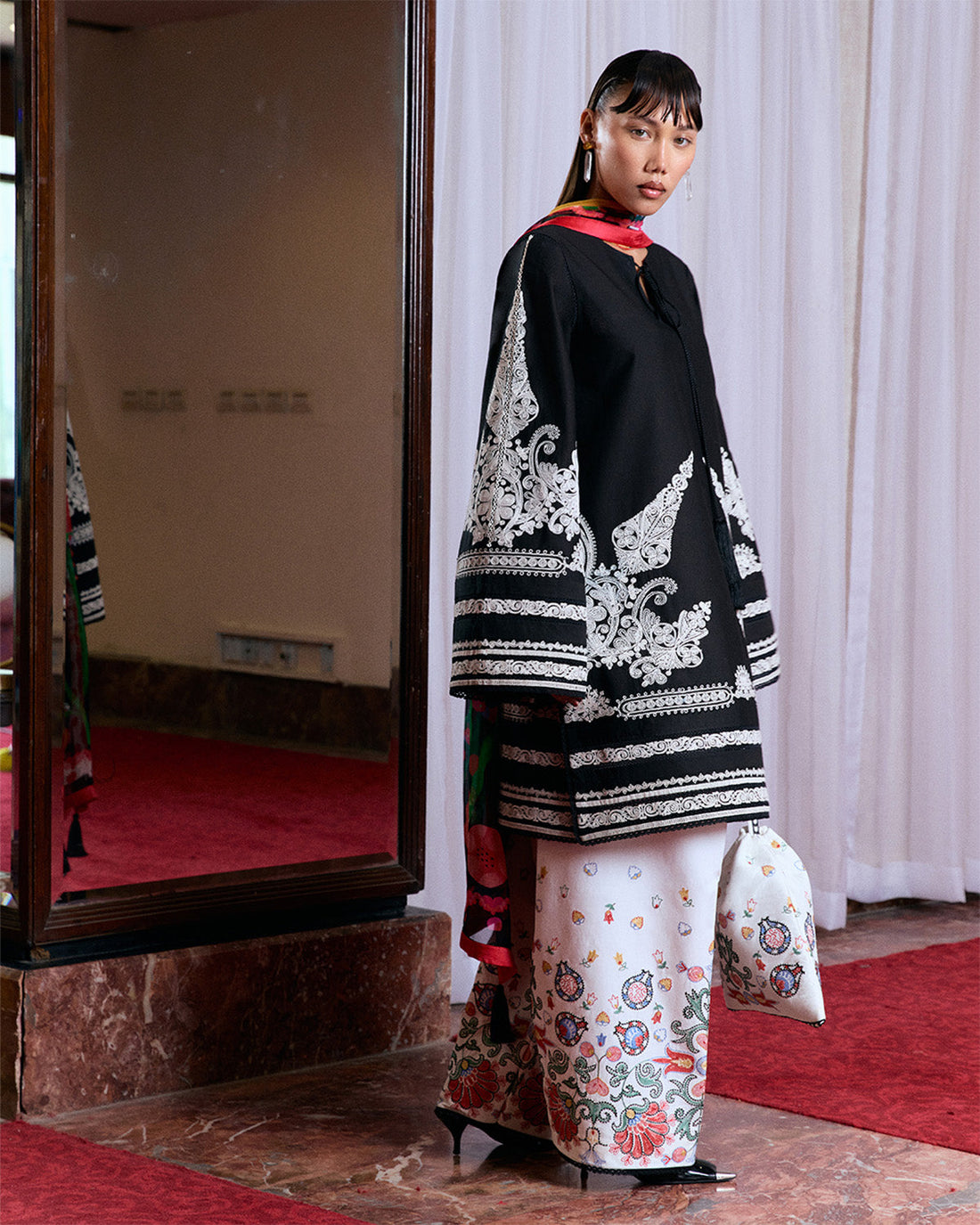 'The Nova Coral three piece ensemble features floral and geometric embroidered motifs in complementing hues....