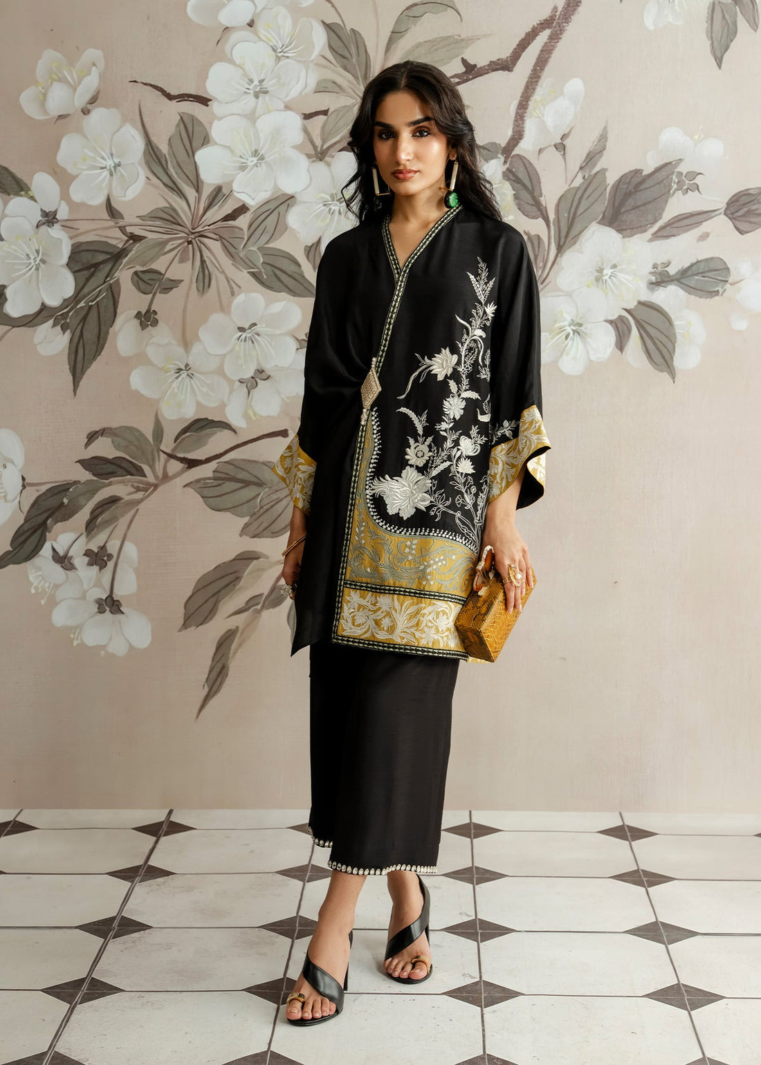A timeless black ensemble crafted in plush Korean raw silk. The sleek kurti and tailored...