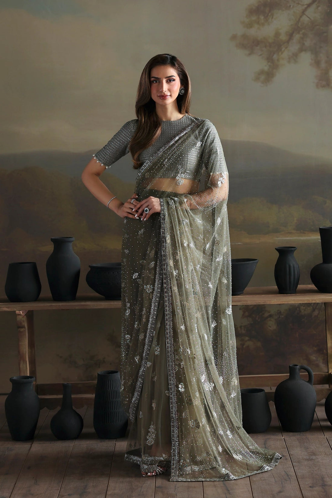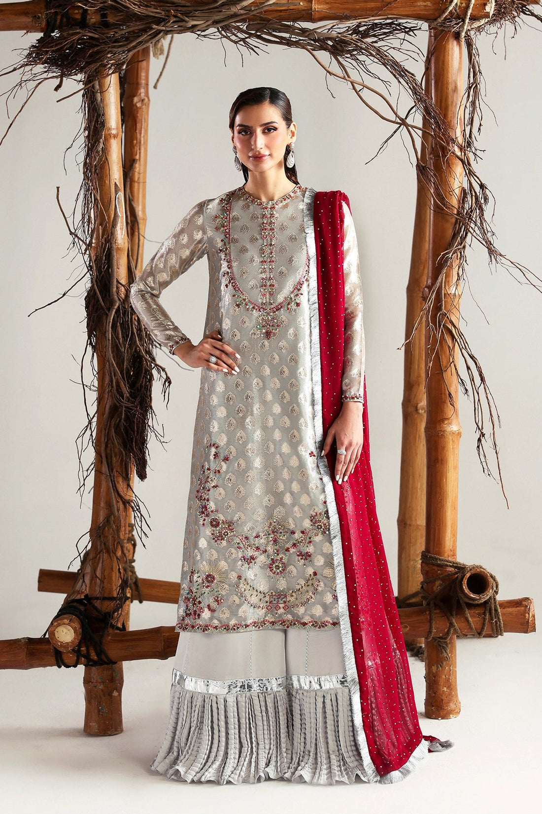 A timeless ensemble crafted in delicate grey shamoos silk, featuring fine embroidery enhanced with subtle...