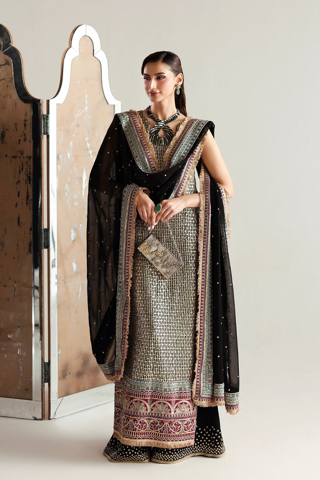 An elegant black chiffon ensemble shirt adorned with intricate sequins and hand embellishments, and a...