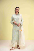 Rendered in a refreshing powder mint tone, this look features delicate tone-on-tone embroidery that enhances its subtle charm. Crafted from airy dobby lawn, it pairs seamlessly with a cotton trouser and a cotton silk dupatta adorned with graceful 3D embroidery an elegant pick for the season.