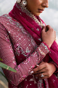 A classic hot pink ensemble featuring a heavily embellished front-open shirt with intricate silver threadwork and detailing. Paired with embellished trouser and a sheer pink dupatta accented with sequin motifs and a detailed border. This look exudes elegance and timeless celebration.