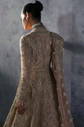 The magnificent peach-pink angrakha-style gown is a beautiful combination of modern appeal and traditional grandeur. This luxurious creation, crafted from opulent organza fabric, features intricate embroidered panels enriched with pearls, cutdana, and beadwork. Subtle accents of light gold tilla and shimmering golden sequins add a radiant touch. The ensemble is completed with an embellished organza dupatta, framed by an intricately embroidered border, exuding a modern yet everlasting grace.