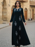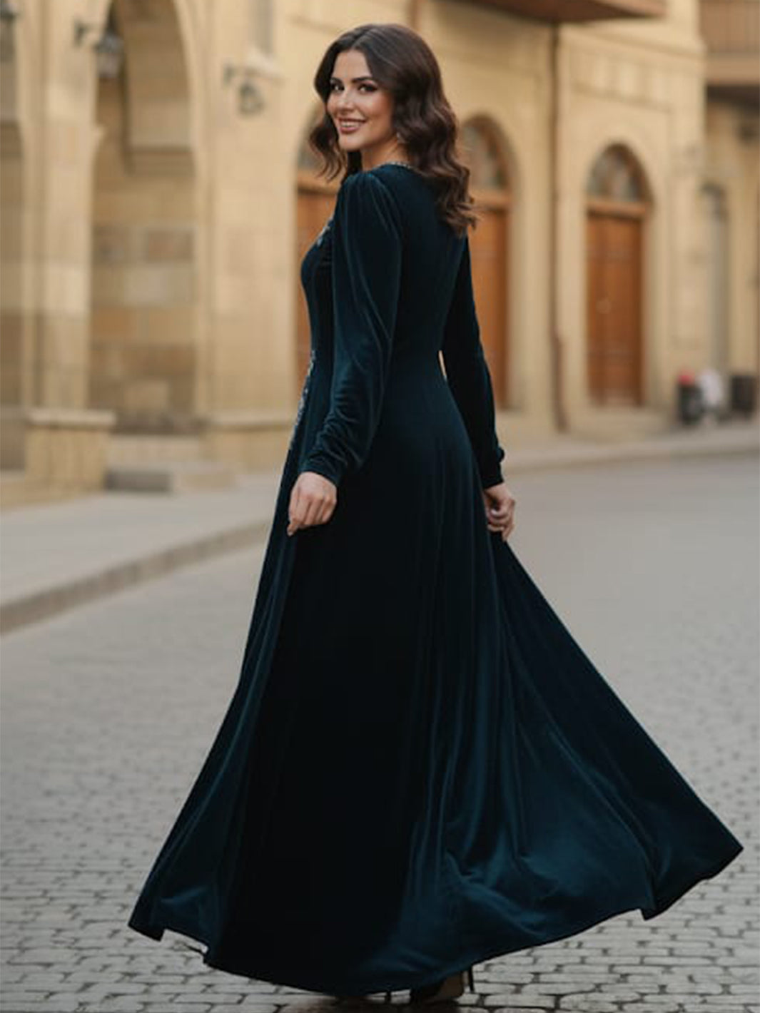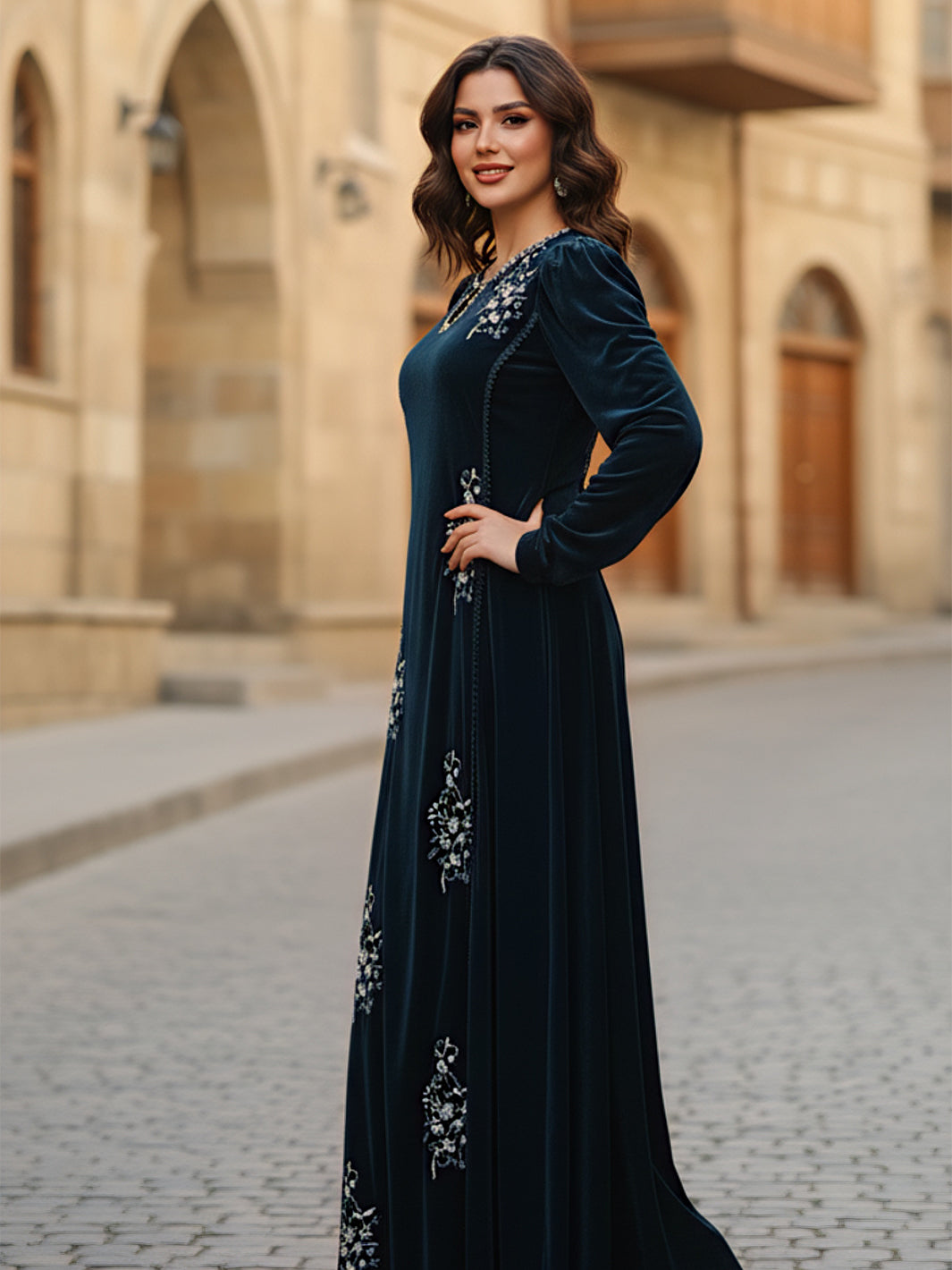 Behold the exquisite beauty of our (9000 premium micro) velvet sequin embroidered maxi! This stunning piece is adorned with hand embellishments, diamond pearls and delicate lace details.