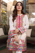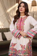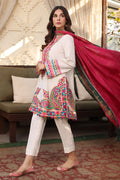 Off-white embroidered karandi lawn shirt paired with a viscose trousers And a luxurious silk printed dupatta for a timeless look.
