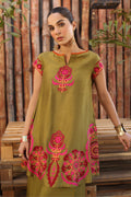 Mehndi green cotton shirt with exquisite aari embroidered motifs, paired with loose pants and a bold shocking pink silk dupatta. Sleeves can be customized for a perfect fit.