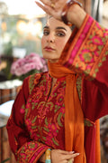 Red cotton net aari embroidered shirt and pants, perfectly paired with a luxurious silk dupatta for a stunning statement.