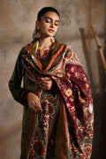 A mehndi green velvet long shirt with a hand worked neckline and embroidered sleeves, paired with Korean raw silk trousers and a printed velvet shawl, creating a look of refined elegance and timeless beauty.