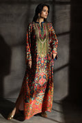 A luxurious velvet kaftan featuring vibrant multi-coloured prints, beautifully accented with delicate embroidery along the neckline for an elegant finishing touch.