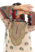 This ivory ensemble stands out with a detailed green neckline and intricate embroidery. Accented with tropical designs and colorful borders, it blends elegance with modern charm.