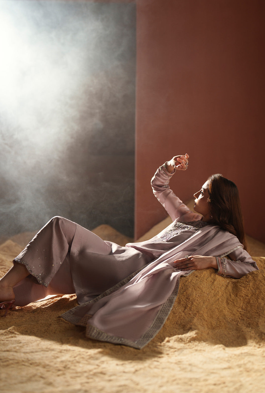 Paired with a silk embroidered dupatta, adding softness and refined detailing.