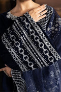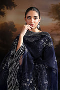 Presenting an opulent navy velvet garment, the design is defined by an embellished front neck and cuffs featuring a prominent geometric sleeves patch in silverwork. The long, elegant silhouette is complemented by an embroidered organza dupatta and a wide silver patch incorporated into the hemline.