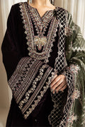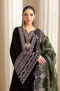 A deep maroon ensemble crafted from rich velvet, adorned with a handmade and intricately embroidered front neck that highlights fine craftsmanship. The outfit is paired with a dyed velvet trouser detailed with delicate patterns for a cohesive finish. An embroidered organza dupatta, accentuated with ornate borders and motif work, adds textural contrast and depth. Designed in a straight long silhouette, this look combines traditional detailing with a structured yet graceful appearance.
