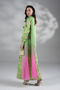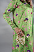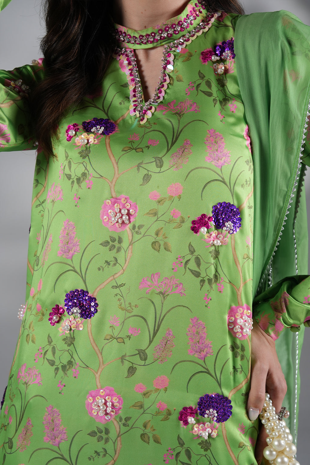 Vibrant printed green charmeuse ensemble with handwork detailing on shirt and matching trouser.