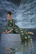 Bottle green embroidered chiffon shirt with hand embellishments, raw silk trouser & chiffon dupatta with lace detailing.