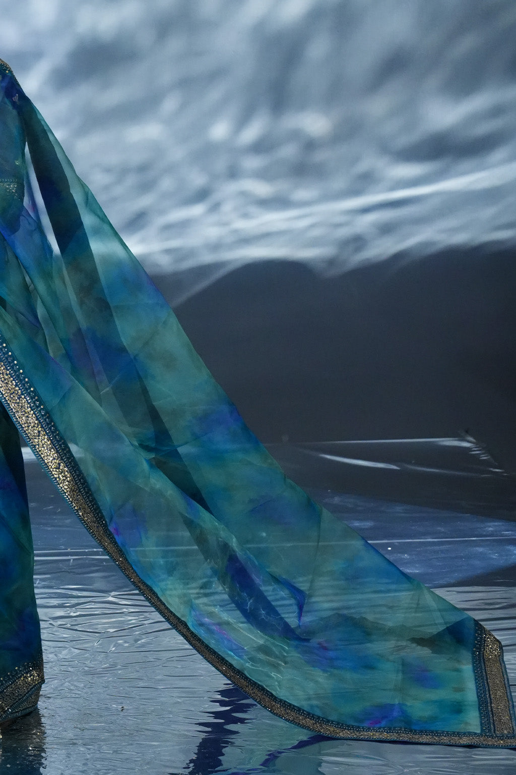 Pallu: Printed organza pallu with embroidered borders for a regal finish