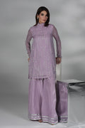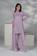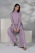 Lilac embroidered chiffon shirt with handwork, paired with premium silk plazo pant with lace detailing.