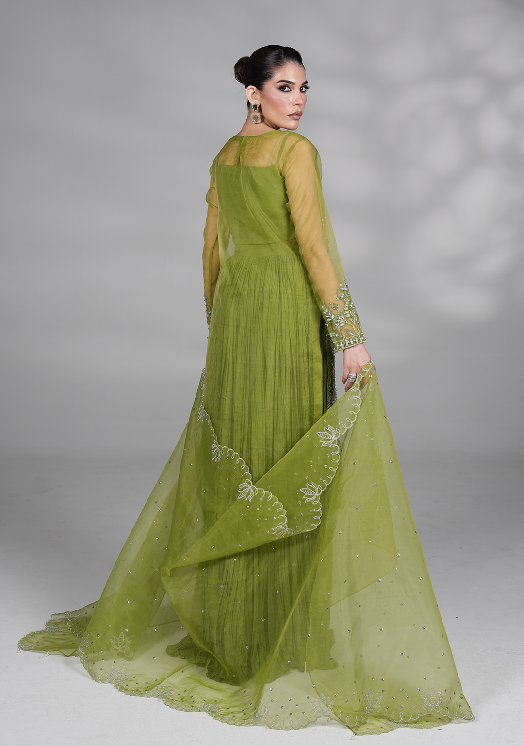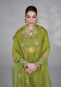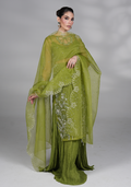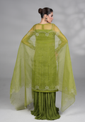 A green organza shirt featuring intricate embroidery & embellished details on the neckline, daman, and sleeves, paired with raw silk crushed sharara, raw silk separate inner and embroidered dupatta with hangings.