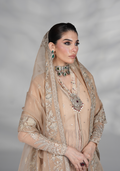 A light beige embroidered gown with delicate embellishments, paired with maching raw silk crushed maxi & embroidered organza dupatta.
