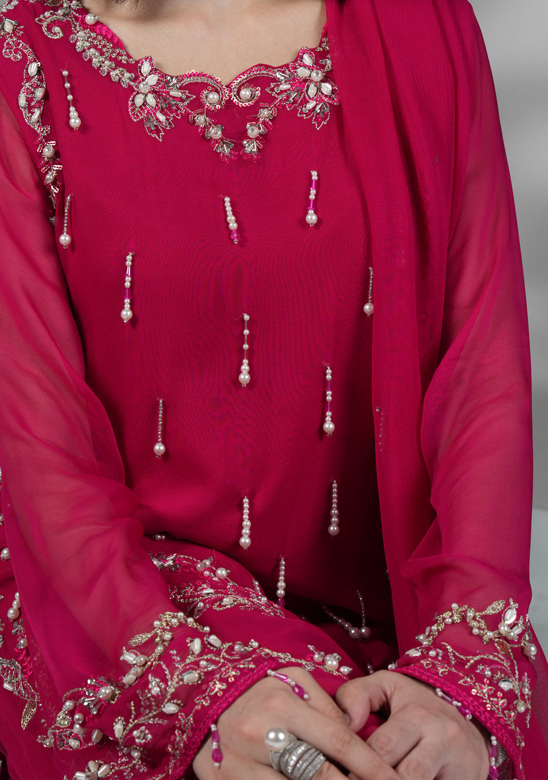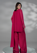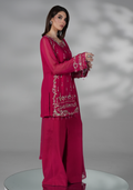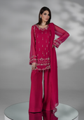 A shocking pink embroidered short shirt with delicate embellished front and sleeves, paired with plazo pants and chiffon dupatta with lace detailings.