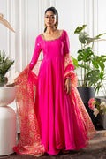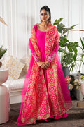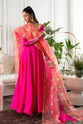 Oh so traditional and luxe is this khaddi silk hot pink flowy kalidar. Amalgamation of hand work( kora dabka, crystals, resham) and embroidery on sleeves is minimal yet so impactful making it perfect for the upcoming shaadi season and Eid get togethers. The dupatta steals the show…our in-house print in contrasting colours and hot pink, finished off with kingri Gota lace. Put statement Tassles at the back makes the back dramatic. Pants are on silk. Style it up with kundan jewellery or studs and a dainty pouch or clutch this season.