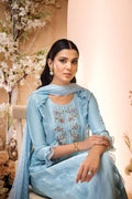 The outfit is completed with matching viscose-silk self print pants & chantilly lace Dupatta.