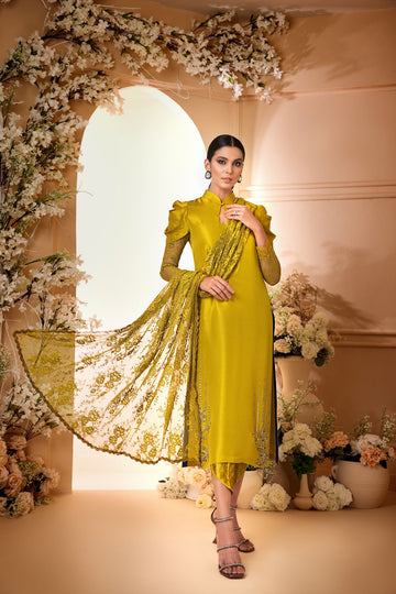 Stand out from the crowd with this beautiful and luxurious Olive Green Raw Silk ensemble. The shirt is made of pure raw-silk material with beautiful hand work on hemline.