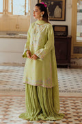 Elevate your Eid ensemble with our Pistachio green raw silk boxy short shirt. This charming piece features intricate aari embroidery work in shades of self, pink, and blue, adding a touch of elegance and vibrancy. Paired with a crushed Dhaka and a medium silk dupatta, this ensemble exudes sophistication and grace, perfect for the festive occasion.