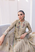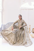 The "Gulbadan" ensemble in taupe green is a stunning display of elegance and artistry. The floor-length kalidar is crafted from khaadi net fabric and beautifully block printed with jewel tones of maroon and emerald green, creating a rich and vibrant look. Hand-worked gota leaf embellishments add a touch of luxury and sophistication. The neckline is intricately embroidered on the front and back, adding to the ensemble's beauty. Paired with straight raw silk pants and an organza dupatta featuring similar block printed motifs, this outfit is a true masterpiece of craftsmanship.