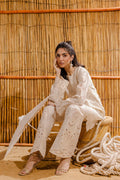 An ivory khaddi silk cord set featuring a cutwork crew neckline and bell sleeves for a balanced blend of structure and fluidity. The bootcut pants are finished with Schiffli embroidery, cutwork, and appliqué detailing, creating depth and texture throughout the ensemble.