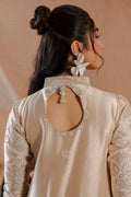 A front-open sheesha silk jacket with long chaak and fitted sleeves. Oversized floral embroidery decorates the front, with light bootis on the back. Tassel details add finishing touches. Crushed medium silk dhaka pants can also be added.