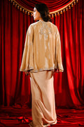 This beige ensemble features a front-open short velvet jacket adorned with exquisite hand embellishment in silver and gold tones. Delicate floral and bow-shaped embroidery, accented with gota, sequins, and cut dana work, adds richness and texture. Paired with a shamoos bandeau and a gracefully draped skirt, this look perfectly balances traditional artistry with modern elegance.