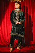 This emerald green kurta and shalwar set showcases exquisite handwork in cut dana, zari, dabka, and sitara, creating a rich play of texture and sparkle. Paired with a screen-printed dupatta that adds a touch of modern artistry, this ensemble beautifully blends traditional craftsmanship with contemporary elegance.