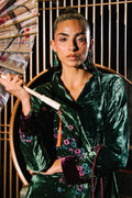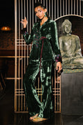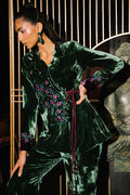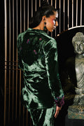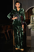 An exquisite emerald green velvet wrap top adorned with cherry blossom–inspired embroidery, enriched with delicate hand embellishments featuring cutdana and sequins for a soft, lustrous shimmer. Subtle purple accents enhance the design, adding a refined pop of contrast, while the notch collar lends a tailored, contemporary touch. Paired with velvet boot-cut pants, this ensemble blends opulence with modern sophistication—perfect for making a graceful yet striking style statement.